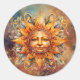 Les autocollants ronds présentent l'illustration d'un art numérique généré par l'IA d'une face de soleil cosmique sur un arrière - plan céleste abstrait.