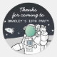 Merci à l'anniversaire de l'espace extra-atmosphérique des autocollants mettant en vedette un astronaute sur la lune, une fusée, des étoiles et un modèle de texte moderne facile à personnaliser.