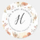 Étiquette d'adresse de retour florale automnale peinte à l'aquarelle avec citrouilles, feuilles d'automne et gourdes, Autocollant rond classique. Élégante étiquette d'adresse de retour qui peut également servir de sceau d'enveloppe ajoutant une touche finale élégante à votre présentation d'invitation. Typographie de script manuscrit avec le nom, l'adresse et le monogramme de l'expéditeur sur un cadre rond simple et moderne. Chaudes couleurs automnales d'orange brûlé, de terre cuite, de brun, de vert atténué et d'ivoire. Peint et conçu graphiquement par l'artiste et designer sous licence internationale, Audrey Jeanne Roberts, copyright.