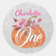 Mignonne automne premier anniversaire classique collant rond avec un grand citrouille orangé et parties scintillant argent brille arrière - plan. Le mot "One" est dans un grand élégant script blanc, et votre nom personnalisé est dans un script rose chaud. Vous pouvez facilement ajouter le nom de votre choix et modifier la couleur et la police en utilisant l'option personnaliser !