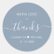 Chic bleu poussiéreux autocollant de remerciement pour vos faveurs de mariage et cartes de remerciement avec "With Love + Thanks" en simple typographie blanche et un élégant script blanc avec des swashes, vos prénoms unis par un coeur et votre date mariage.