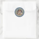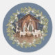 Cet autocollant traditionnel de Noël présente une image de nativité du bébé Jésus dormant dans une crèche avec Marie et Joseph au centre entourée d'une couronne de baies blanches.