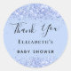 Un autocollant pour un baby shower, célébrant un bébé garçon. Un arrière - plan bleu clair, bleu bébé, avec de la poussière de parties scintillant fausse. Le texte : Merci est écrit avec un grand script de style à la main moderne. Personnalisez et ajoutez un nom.