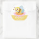 Caricature mignonne d'une abeille jaune et marron avec de grands yeux mignons avec une sucette bleue dans la bouche, reposant paisiblement sur une fleur orange et rose. Bannière jaune disponible pour la personnalisation. Ce kawaii et joyeux design en fait un autocollant idéal pour étiqueter la fête des baby showers favorise le sac de bonbons, laissant une belle impression avec vos invités. Vous pouvez modifier l'Arrière - plan dans votre couleur de choix à l'aide de l'option arrière - plan sous mode personnalisation. Conçu par Rusty Doodle.