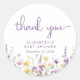 Un autocollant élégant et fantaisiste pour votre douche bébé fille vous remercie cartes et faveurs de fête avec "merci" dans un script violet élégant, et aquarelles d'inspiration boho de dainty violet, rose et jaune fleurs sauvages. Ajoutez le nom de la mère à être en lettres simples et modernes.
