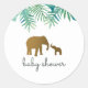 Un autocollant tendance avec une fausse maman dorée et un petit éléphant, "baby shower" dans une police de caractères mignonette et une bordure de feuilles tropicaux verdoyants.