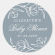 Élégants autocollants de baby shower floral avec des fleurs blanches esquissées et des feuilles avec un arrière - plan bleu poussiéreux. Personnalisez les autocollants à baby shower floral avec votre nom et la date. Les autocollants à fleurs sont parfaits pour sceller les sacs de baby shower, les enveloppes d'invitation, et plus encore! Conçu pour coordonner avec notre collection Sketched Floral.