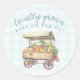 Ajoutez une touche douce et rustique à vos faveurs de baby shower, enveloppes ou décors de fête avec cet autocollant rond "Locally Grown Baby On The Way" ! Doté d'un chariot de légumes aquarelle rempli de fruits et légumes frais et de la phrase "Bébé local sur le chemin" en charmant script, ce design capture le coeur d'une ferme ou d'une célébration sur le thème du jardin. Le bleu doux en vichy l'arrière - plan cravate tout en ajoutant un charme rustique et confortable.