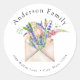 Partie de la collection Long Distance Baby shower by Mail avec enveloppe d'aquarelle remplie de fleurs sauvages avec tulipes roses et lavande.