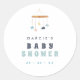 Un auto-collant moderne bleu bébé pour bébé douche avec illustration d'un bébé mobile avec étoiles, nuages et lune. "baby shower" est en gras bleu. Personnalisez avec vos détails. .