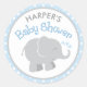Un autocollant élégant et sucré de baby shower est doté d'un texte personnalisé qui peut être personnalisé avec le nom de la mère et un adorable veau d'éléphant nouveau-né avec des éclaboussures en forme de coeur. Le design rond comprend un motif de pois et comprend un modèle de couleur bébé garçon clair bleu poudreuse, gris et blanc.