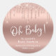 Un autocollant élégant et luxueux pour vos cartes de remerciement de baby shower et sacs de faveur qui comprend la fausse parties scintillant en or rose qui coule du haut et "Oh Baby!" dans un script blanc élégant en dessous contre un arrière - plan en or rose. Vous pouvez facilement personnaliser le nom de la future mère et un message de remerciement.