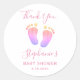 Ces mignons Stickers Merci Baby shower sont décorés de typographie rose et aquarelle pluviaux pieds bébé. Le texte est personnalisable.