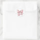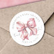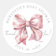 Un autocollant pour une baby shower avec un joli nœud rose bébé mignon dans un style aquarelle rose pastel. En haut, il y a le nom de la mère et "Baby Shower", et en bas, la date. Au centre, à côté du nœud rose, se trouve "Merci !" en écriture cursive. Ce design simple et minimaliste pour une baby shower classique comporte un texte gris dans un mélange de police serif et de typographie cursive, créant un look de coquette sophistiqué mais mignon et élégant. Vous pouvez changer les couleurs de police et la couleur de fond selon vos préférences. Étiquette d'autocollant de remerciement pour une baby shower avec un thème élégant et personnalisé de nœud rose aquarelle.
