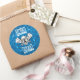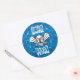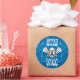 Baignade freak 3 pouces rond autocollant, avec un arrière - plan d'eau de piscine bleu profond. Crâne, nageoires lunettes faites en blanc avec une arête noire. Police freak de nage fait en blanc aussi avec une frontière noire.