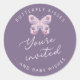 Baisers à papillon + Voeux pour bébé Sticker/Sceau à enveloppe violette avec un design papillon floral et texte "Vous êtes invité". Les lignes de texte courbes du haut et du bas sont personnalisables.