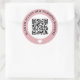 Site web mariage QR code autocollant en noir, rose et blanc avec texte courbé et un coeur blanc. Baguette de code QR mariage noir, rose et blanc.