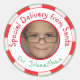 Ces étiquettes-cadeaux festifs, sur le thème de Noël, présentent un cadre extérieur vert, suivi d'un cadre rouge et blanc en sucre de canne de menthe poivrée motif. Le message "Livraison spéciale de Père Noël" est imprimé en haut dans une police rouge fantaisiste. Un nom d'exemple est imprimé en vert en bas. Une photographie est placée dans le centre que vous pouvez remplacer par la photo ou l'image personnalisée de votre enfant.