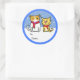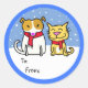 Étiquettes cadeaux avec chien et chat mignon dans la neige portant des foulards rouges. Design rond avec bordure bleue. En bas, on dit À et De.