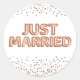 Ces étiquettes autocollants personnalisés présentent un thème mariage festif sur un arrière - plan blanc. L'expression "Just Married" est imprimée dans des ballons brillants, roses en feuille d'or. Rose parties scintillant en or confetti accentue les parties supérieure et inférieure des autocollants.