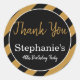 Motif rayé noir et or avec fête d'anniversaire blanc merci sticker. Le design comprend un motif à rayures noir et blanc, un cercle noir avec une bordure blanche et votre texte personnalisé en or et blanc.