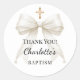 Celebrate your child’s Baptism with this elegant round sticker featuring a luxurious ivory bow with delicate pearl details and a subtle gold cross on a classic white background.