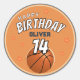 Basketball Ball Sports Happy Anniversaire Classic Round Sticker. Un autocollant moderne personnalisé de célébration d'anniversaire sportif avec un ballon de basket, nom et âge. Vous pouvez modifier n'importe quel texte sur les autocollants.