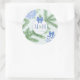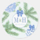 Un élégant autocollant pour un mariage de Noël avec mes illustrations d'aquarelle originales (d'une branche de sapin avec des billes de chinoiserie bleues et blanches).