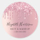 Chic autocollant pour les fournisseurs de services de beauté avec des gouttes de faux parties scintillant rose et votre nom dans un script branché contre un arrière - plan de faux papier rose. Parfait pour les salons de beauté, les maquilleurs, les coiffeurs et les esthéticiennes.