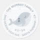 Joli autocollant d'adresse de retour en forme d'étoile mignonne baleine nouveau-née avec nom et adresse personnalisés modernes bleu poussiéreux sur un fond rayé bleu pastel. Cet autocollant d'adresse rond et mignon est parfait pour envoyer des faire-part de naissance ou des invitations à une fête de bébé. Découvrez plus de modèles de design inspirés de l'océan pour bébés et enfants avec des créatures marines, décoration de nurserie côtière et idées de cadeaux pour nouveau-nés réalisés avec une douce brise marine par © y.BEE SEA #zazzlemade #autocollantrond #fêtedebébé #baleinemignonne