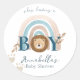 Ces étiquettes d'autocollants de baby shower personnalisé mignon présentent une illustration de safari bohème de style aquarelle. Le mot garçon a une tête de lion au centre. Un arc-en-ciel bleu et beige de sauce est représenté à l'arrière. Les mignons lotus pawprints sont imprimés le long de la gauche.