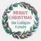 Joyeux Noël de l'autocollant avec une belle couronne de Noël avec verdure et baies personnalisées avec votre nom de famille. Verrerie de Noël sticker cadeau de Noël en vert et rouge avec une couronne de baies.