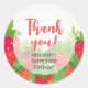 Bons fraises rouges aux couleurs vives, aux feuilles verts et texte audacieux et amusant, parfait pour une joyeuse fête de premier anniversaire de fille! Nom personnalisé personnalisable merci fête d'anniversaire en faveur autocollant. Célébrez le premier anniversaire d'une petite fille qui aime les fraises avec cette adorable et adorable ferme de fraises thème 1er anniversaire invitation fête. Des oeuvres d'art à l'aquarelle de fraise rouge vif créent un thème doux et amusant pour sa célébration.