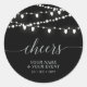 Cet autocollant chic personnalisé ajoutera des détails élégants à votre journée spéciale. Ce design est composé de lettres d'argent " Cheers " et de lampes à cordes sur un arrière - plan noir. Des invitations de fête d'anniversaire et des papeteries sont disponibles dans ma boutique BaraBomDesign.