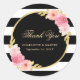 Elégant mariage floral rayé noir et blanc personnalisé merci les autocollants avec des fleurs roses pastel et doré. Personnalisez facilement en ligne.
