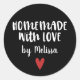 Un autocollant personnalisé "fait maison avec amour" sur un arrière - plan de couleur noire. Faites-le le vôtre en ajoutant votre propre nom. Une jolie touche de finition pour tous vos cadeaux faits main. Conçu pour vous par Blackberry Boulevard.