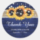 Étiquettes de cadeaux de mariage personnalisées bleu marine et tournesol rustiques de campagne idéales pour votre mariage champêtre, jardin, ou grange, inspiré par les fleurs de tournesol. Articles assortis disponibles pour ces autocollants de remerciement de mariage rustiques floraux avec des tournesols sur un fond de bois de grange orné de guirlandes lumineuses, toile de jute et dentelle.