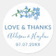 Floral merci autocollant pour votre mariage en blanc avec une brindille d'oublier-moi-non et de charmantes polices bleues. Ajoutez vos noms et votre date de mariage.