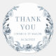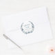 Plongez-vous dans le charme classique de nos autocollants ronds de remerciement mariages bohèmes, ornés d'une délicieuse couronne de fleurs bleues et grises poussiéreuses personnalisées avec les noms de la mariée et du marié en écriture calligraphie minimaliste bleue. Idéal pour les fêtes de jardin extérieur d'été ou d'automne.