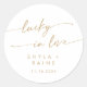 Cet autocollant boho chic or et blanc chanceux en amour favorise classique rond est parfait pour un mariage minimaliste. L'or jaune neutre et le design bohème moderne blanc présentent une calligraphie rustique simple avec un style unique mais classique. Personnalisez vos autocollants de faveur avec vos noms et votre date de mariage.