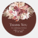 Round wedding thank you sticker with pampas and burgundy blush florals on deep rosewood background — customizable with couple’s names and date.