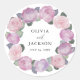 This romantic round wedding sticker features original watercolor roses in soft blush pink and delicate purple tones, arranged in a graceful floral wreath. The hand-painted blooms frame the couple’s names and wedding date at the center, creating an elegant and timeless design. Perfect for sealing envelopes, decorating favors, or adding a cohesive finishing touch to your purple and pink rose wedding theme.