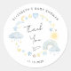 Whimsical baby boy shower Merci sticker avec "Merci" dans un script élégant et boho inspiré bleu et jaune aquarelles d'un arc-en-ciel, soleil, coeurs, étoiles, lunes et nuages. Personnalisez avec le nom de la future mère et la date de la douche dans une simple typographie.