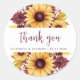 Cet autocollant mariage rustique présente un design floral d'aquarelle luxuriant composé de tournesols jaunes et de feuillage bordeaux. Les mots "merci" apparaissent dans la calligraphie élégante de l'écriture manuscrite bordeaux. Ajoutez les noms du couple et la date du mariage ci-dessous.