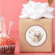A rustic package label with a boho style terracotta wildflower in the middle, round format with central floral and curved text. Earthy and elegant.