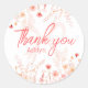 Boho Wildflower Baby Shower Thank You Favor Classic Round Sticker Elegant Thank You stickers for your baby shower guest favors, featuring a delicate watercolor meadow of wildflowers in soft pink and peach hues. The airy design and modern script typography create a whimsical, garden-inspired aesthetic perfect for a spring or summer baby shower. Personalize with mom's name. Match with the Boho Wildflower Baby in Bloom Girl Baby Shower Invitation and other party supplies to complete your elegant Baby Shower theme in the collection at Cross Fox Design..