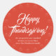 Bon thanksgiving texte de script personnalisé et nom mignon élégant faveurs Stickers Classic Round. Élégante typographie de calligraphie script entourée d'une délicate couronne ronde de citrouilles mignons. Texte blanc entièrement personnalisable sur l'arrière - plan couleur rouge orange vermillion. Idéal comme étiquettes cadeaux pour des cadeaux et des faveurs personnalisés.