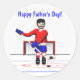 Stickers avec mon ordinateur illustration d'un joueur de hockey amusant avec un oeil noir et des dents manquantes, debout sur la glace devant un filet de gardien de but. Le texte dit "Bonne Fête des pères !"