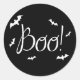 Un autocollant Halloween Boo ! noir et blanc avec typographie décalée avec chauves-souris. Cet autocollant est parfait pour les faveurs de la fête d'Halloween.