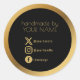 Des autocollants ronds élégants en noir avec une bordure et un lettrage à effet doré brossé affichent "fabriqué à la main par VOTRE NOM", ainsi que des icônes de réseaux sociaux assortis et un espace pour les identifiants, parfaits pour sceller les colis Etsy, les boîtes de produits et les envois avec une finition luxueuse. Le texte est entièrement personnalisable pour un nom de boutique, un court remerciement ou des notes saisonnières, ce qui rend ces étiquettes polyvalentes pour une marque quotidienne ou des commandes de Noël et un emballage cadeau. L'apparence dorée est un effet imprimé.